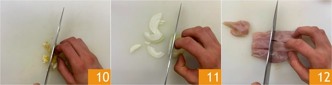 Chop the ginger 10 with a knife, slice the onion 11, and cut the chicken breast into 1-inch long and 0.4-inch thick pieces 12.