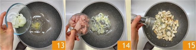 In a large pan, heat the sunflower oil, add the chopped ginger and onion 13, and sauté for a few minutes. When the onion becomes transparent, add the chicken pieces 14 and brown them until golden. Adjust with salt and pepper 15.