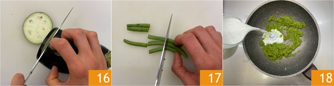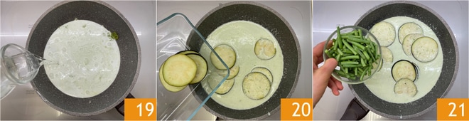 Meanwhile, cut the eggplant into 1/4-inch thick slices 16, trim the green beans and cut them in half 17. Remove the chicken from the pan and set it aside. In the same pan, pour the green curry paste, sauté for a few minutes, then deglaze with coconut milk 18.