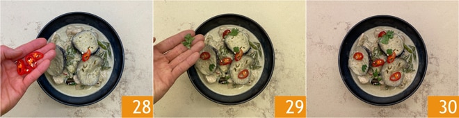 Plate it, and complete with chili pepper 28 and fresh coriander 29. Your Thai green curry is ready to be served 30