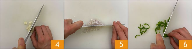 Chop the garlic 4 and shallot 5 with a knife. Remove the seeds and internal filaments of the chili pepper and chop it finely 6.