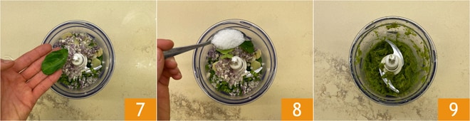 Place all the ingredients in a mixer, add a few kaffir lime leaves 7, a teaspoon of salt 8, and blend until you obtain a homogeneous paste 9.
