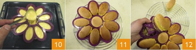 Then pour the obtained mixture into a 9.5-inch diameter flower-shaped cake pan 10 placed on a baking sheet. Bake in a preheated static oven at 347°F for 45 minutes (or at 311°F for 35 minutes if using a convection oven). Remove the flower cake from the oven and let it cool on a rack still in the pan 11. Then, carefully apply light pressure on the bottom of each part of the cake to remove it from the pan 12.