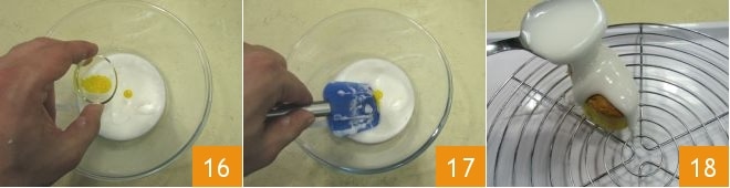 Pour a small amount of the mixture into another bowl and add a drop of yellow liquid food coloring 16. Mix the liquid coloring evenly to make the color uniform 17. Now proceed with decorating your daisy flower cake. First of all, place the rack with the cake on a tray to collect any glaze that may drip during the coverage of the cake. Using a spoon, pour the white glaze over the petals of the cake to completely cover the petals 18.