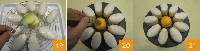 Using a spoon, pour the yellow glaze over the central part of the flower cake and smooth the glaze across the entire length of the cake 19. Brush additional red or orange powdered food coloring when the glaze is still wet to give a more intense color to the central part of the cake 20. And here the daisy flower cake is ready to be enjoyed 21!