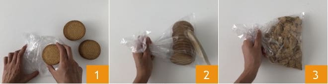 To make the deconstructed cheesecake, first place the cookies in a food bag 1 and crush them with a rolling pin or wooden spoon 2. They should be roughly crumbled 3.