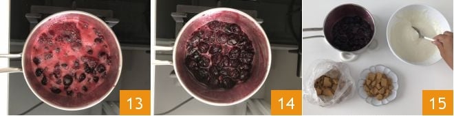 Pour the cherries into a saucepan 10, add the sugar 11 and the lemon juice filtered through a sieve to hold back the seeds 12.