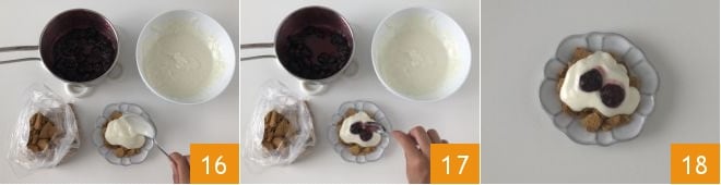 cover them with the yogurt cream 16 and finally flavor with the cooked cherries 17. Your deconstructed cheesecake is ready to be served 18.