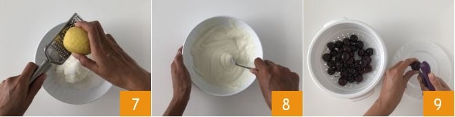 Flavor with the lemon zest 7 and mix with a fork to combine the ingredients 8. Store the cream in the fridge and take the cherries: wash, dry, and pit them with the appropriate tool 9.
