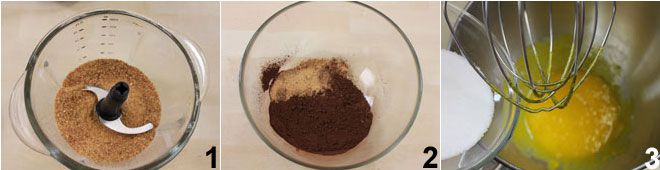To prepare the chocolate beer and strawberry dessert, start by grinding the amaretti in a mixer 1, transfer them to a bowl and add the sifted unsweetened cocoa powder 2, mixing all the powders well together. Whisk the egg yolks together with the sugar 3 using a stand mixer or electric whisk until you obtain a creamy and light mixture.