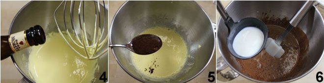 Add the beer 4, then the cocoa and amaretti powder 5, continuing to mix with the electric whisk, and finally the milk 6. Continue mixing to blend all the ingredients well: the mixture should be quite liquid.