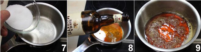 Now proceed to prepare the caramel: in a saucepan, pour the sugar 7 and the beer 8. Cook until the sugar is completely dissolved 9.