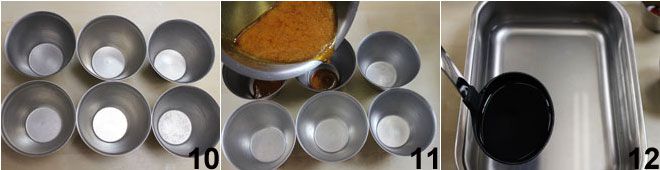 Prepare six aluminum panna cotta molds (with a capacity of about 4.4 oz, 3.15 inches in diameter and 2.36 inches in height) 10 and pour a bit of caramel on the bottom of each one 11, trying to make it adhere well to the sides as well. Prepare a baking tray large enough to hold all the molds and fill it halfway with water 12.