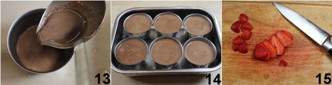 Pour the dessert mixture into the molds with the help of a ladle 13, arrange them in the tray 14 and bake in the oven for 45-50 minutes at 356°F. Cut the strawberries 15 as you prefer for the final decoration of the dessert. Once cooled, unmold, and your chocolate beer and strawberry dessert will be ready to be enjoyed.
