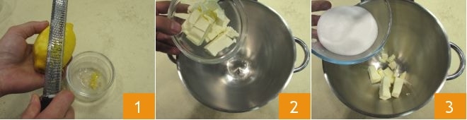 start mixing the ingredients with the paddle attachment 4, then add the eggs 5 and the grated lemon zest 6.