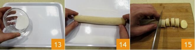 Once ready, take them out of the refrigerator and prepare two trays. In one, spread the granulated sugar 13 and roll 1 or 2 of the logs to adhere the sugar to the surface 14. Then cut the diamantini, discs about 3/8 inch thick 15.