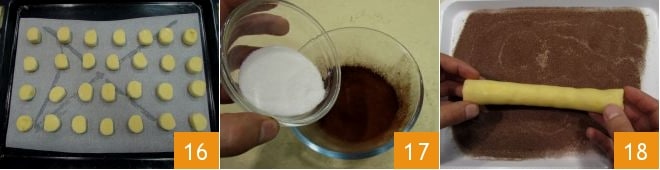 Place them well spaced on a greased and parchment-lined baking sheet 16 and bake in a preheated static oven at 356°F for about 10-12 minutes (320°F for about 4-6 minutes if using a fan oven; they should not darken too much; you can also bake a few at a time to better adjust time and temperature). Meanwhile, coat the remaining logs with cocoa: in a bowl, mix the sifted unsweetened cocoa powder with the granulated sugar 17, spread it on a tray, and roll the logs of dough in it 18.