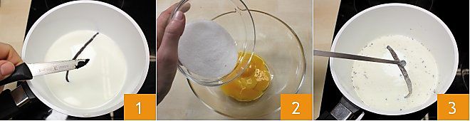 To prepare diplomatic cream without gelatin, start by preparing the pastry cream: heat the milk in a saucepan with half a vanilla bean and its seeds 1. In a bowl, whisk the egg yolk and sugar 2, then add the flour. Use tongs to remove the bean 3.
