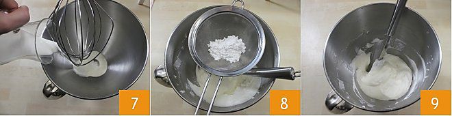 Prepare the Chantilly cream: pour the well-chilled cream into the bowl of a stand mixer equipped with a whisk 7, or use an electric mixer, and whip it; when the cream has reached a thick consistency, add the sifted powdered sugar 8, and fold it into the cream, stirring with a spatula 9.
