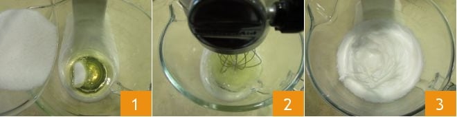 To prepare the Dobos Torte, start by making the batter for the disks. Take the eggs and separate the yolks from the whites into two different bowls. Add half of the sugar to the whites 1 and start whipping them 2 until you get a foamy and firm mixture 3.
