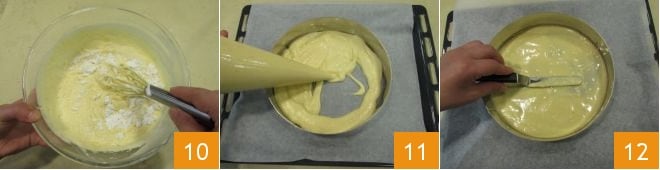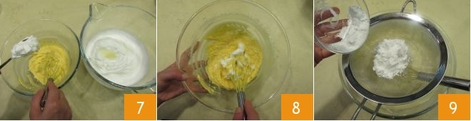 At this point, incorporate the egg whites into the yolk mixture, little by little 7, stirring gently from bottom to top with a whisk 8. Sift the flour together with the cornstarch 9.