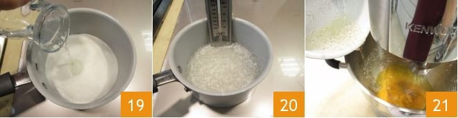 Place the sugar with the water in a thick-bottomed saucepan 19 and heat it over low heat, stirring occasionally with a spoon. Once the sugar has dissolved, stop stirring and bring the syrup to a temperature of 250°F 20, using a kitchen thermometer. When the syrup is nearly at temperature, add the yolks to the bowl of a mixer and start whisking them at medium speed. As soon as the syrup reaches the indicated temperature, pour it in a thin stream into the mixer while it is still running 21. Continue to work it until completely cooled.