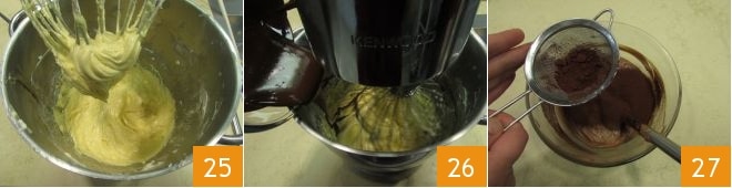 Continue this way until all the butter is used and whip until you obtain a creamy mixture 25. At this point, incorporate the melted chocolate, now cooled, into the mixer 26, then transfer the chocolate buttercream into a bowl and also add the sifted cocoa powder 27.