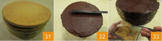 Finish in this way with all the disks except one which you should set aside for the final decoration, and leaving the last disk without cream 31. Cover your cake (composed of 7 disks) with chocolate buttercream, using a spatula, to achieve a smooth and even coating 32. Coat the sides of the cake with hazelnut crumbs 33 and transfer the remaining cream into a piping bag with a star nozzle. Refrigerate both the cake and the cream.