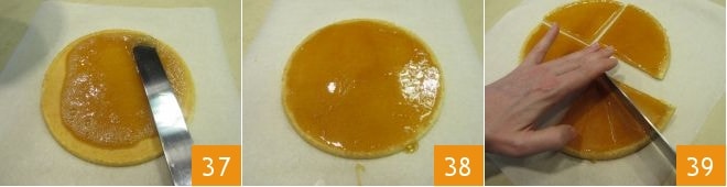 With the help of a spatula, spread the caramel 37 to cover the entire surface 38 and let it dry for 2-3 minutes. Then, grease a knife with a smooth blade and use it to divide the disk into 16 wedges 39.