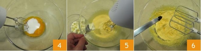 Set your whipped egg whites aside (in the refrigerator) and add the other half of the sugar to the yolks 4. Start whipping them, and once you obtain a light and fluffy mixture, add the butter (at room temperature) little by little 5 and also the seeds from a vanilla bean 6 (to extract them, you'll need to cut the bean and scrape it with a sharp knife).