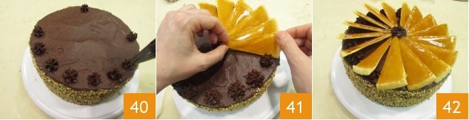 Take the cake from the fridge and use the piping bag with a star nozzle filled with chocolate buttercream to create decorative rosettes 40. Place the caramelized wedges on the cake obliquely between the various cream rosettes 41 and finish the cake with one last rosette in the center 42. Refrigerate the Dobos Torte for at least 1 hour before serving.