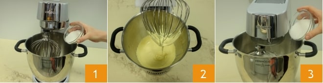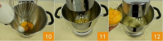 incorporate the sugar 10 and start working the ingredients 11. When the mixture becomes light and airy, add the yolks 12, continue working the mixture with the beaters for a few more minutes, then pour it gently into a bowl.