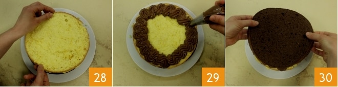 Then place a light sponge cake disc 28 and a layer of chocolate custard using another piping bag with a star nozzle 29. Cover with a layer of chocolate sponge cake 30 and continue layering the creams and sponge until finishing with the dark sponge cake.