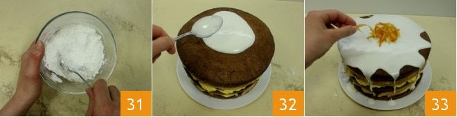 In a small bowl, pour the powdered sugar and gradually add hot water, mixing until you get a smooth and fluid consistency 31. Pour the glaze over the cake starting from the center 32 so it gradually drips down the sides. Decorate with candied orange peel 33 and serve your double chocolate and orange cake!