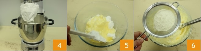 When you have achieved a soft consistency, turn off the processor 4 and add the egg whites to the yolks, gently mixing with a spatula from top to bottom so as not to deflate the mixture 5. Sift the cornstarch and flour into the bowl 6.