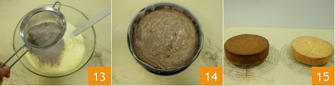 Add the sifted flour, cornstarch, and cocoa powder 13. Mix with a spatula from the bottom to the top gently without deflating the mixture. Butter and line with parchment paper a 9.5-inch diameter pan, pour the obtained mixture inside 14 and bake it in a static oven at 356°F for 45 minutes (320°F for 40 minutes if using a fan oven). Once cooked, remove the sponge cakes from the oven and let them cool slightly, then unmold them and place them on two racks to cool completely 15.