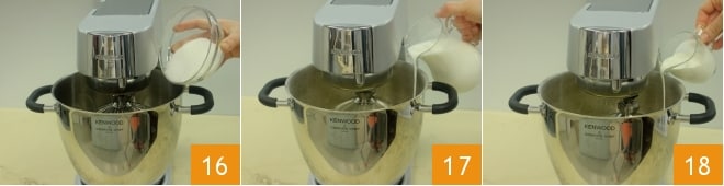 In the meantime, focus on the cream: pour the eggs and sugar into the food processor bowl and start whipping with the beaters 16 until you obtain a light mixture. Add the sifted cornstarch and gradually add the milk and cream (17-18). When everything is well mixed, change the beater to the rubber beater, set the processor temperature to 212°F, and cook for 6-7 minutes,