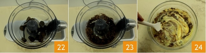 With the blender, coarsely chop the dark chocolate (22-23) and melt it in the other bowl with the still hot custard 24.