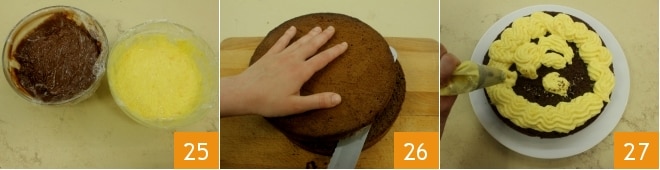Also cover the chocolate custard with cling film in contact, so you'll have both creams ready for filling 25. From the now-cold sponge cakes, cut out discs: 3 from the dark one 26 and 2 from the light one, to form 5 layers. Place the first dark disc on the serving plate and fill with a layer of custard using a piping bag with a star nozzle 27.