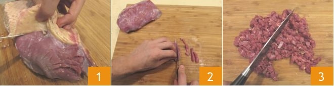 To prepare the duck burgers with citrus mayonnaise, start by removing the skin and visible fat from the duck breast 1. Then cut the meat into strips 2 and then into cubes to make it easier to chop with a knife 3.