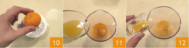 squeeze the tangerine 10 and add its (strained) juice to the bowl 11. Also add the apple cider vinegar 12