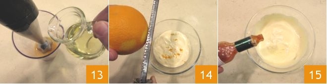 and, while starting to blend, slowly add the sunflower oil 13. Finish your mayonnaise with the grated orange zest 14 and a few drops of Tabasco 15.