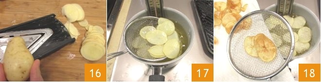 Prepare the chips: wash and dry the potatoes, and slice them into 1/25 inch rounds using a mandoline 16. Fry the chips in abundant oil preheated to 338°F (you can use a kitchen thermometer to measure the exact temperature) 17, drain them, lightly salt them, and let them dry on a sheet of paper towel 18.