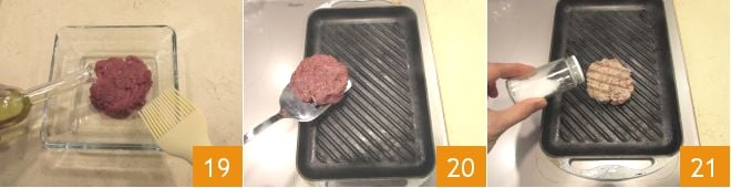 Take your burgers out of the fridge, brush them with a tiny bit of oil 19, and place them on the hot grill 20. After 2 minutes, turn them to the other side, season with salt and pepper 21, and grill for another 2 minutes (the meat should remain pink inside).