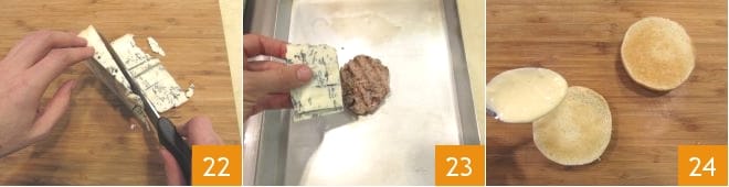 Cut the spicy blue cheese into slices 22, and distribute it over the burgers, which you place on a baking sheet 23: put everything in a preheated oven at 482°F with the grill function for 3 minutes. Cut the buns in half and also grill them for 1-2 minutes with the cut sides up. Then spread mayonnaise on the bottom half 24
