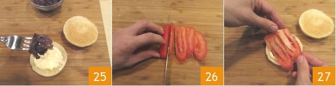 and continue assembling the buns by adding the caramelized onions 25. Slice the tomatoes 26 and place them on top of the onions 27.