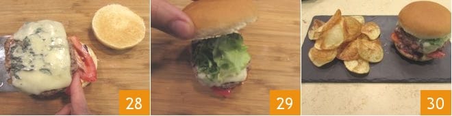 Complete with the burgers with blue cheese 28, a bit of mixed greens, and close the buns 29. Serve them hot, accompanied by the chips 30.