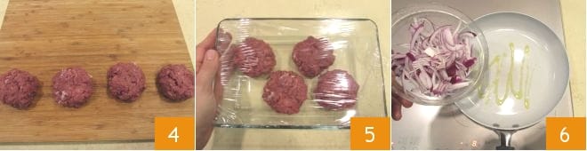 From the minced meat obtained, make 4 burgers of equal size 4, place them in a baking dish, cover with plastic wrap, and transfer to the fridge to firm up for at least half an hour 5. In the meantime, focus on the onions: slice them thinly and place them in a large pan where you've heated a little oil 6.
