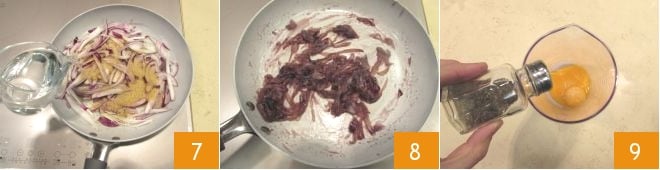 Add the brown sugar and water 7 and cook the onions for about 10 minutes, stirring often: they will be ready when they are well wilted and the water has completely evaporated 8. Now, prepare the citrus mayonnaise: place the egg yolks with a pinch of salt and pepper in the mixer bowl 9,