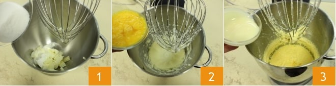 To prepare the Easter egg cake, start with the base: in a stand mixer bowl fitted with beaters, add the softened butter cut into pieces and the sugar 1 and cream them together. Then add the eggs 2 and condensed milk 3.